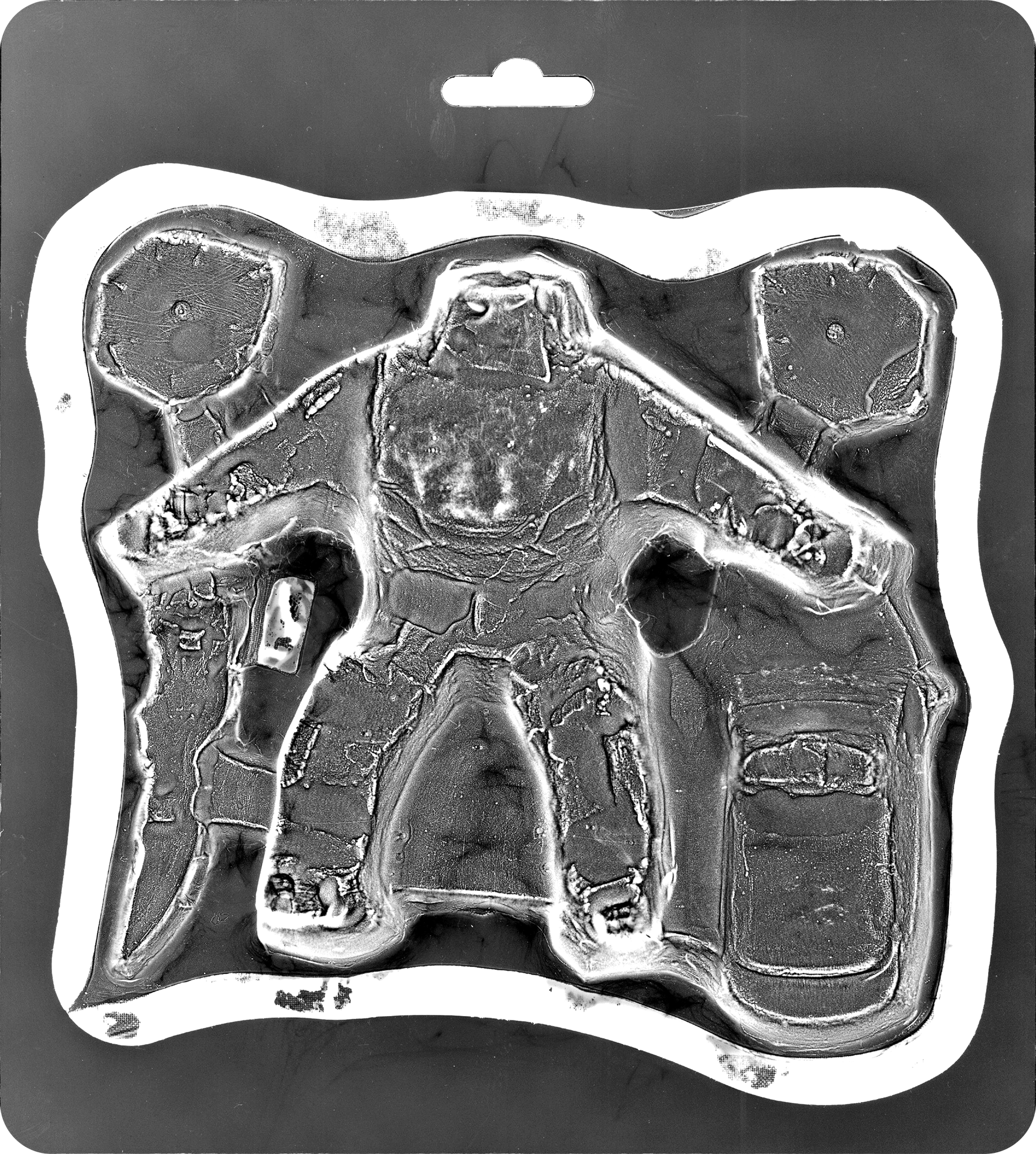 The vacuum-sealed plastic wrapping, captured in its ghostly imprint on the photo paper, serves as a tangible manifestation of this paradoxical allure. An attempt to capture and archive the membrane of the so called „new“. Thus, each individual print is unique, despite originating from mass-produced exposure templates. The size and name of each print are based on the original packaging of the respective toys. Resulting in titles such as "Space Race Adventure", "Robot Forces", "Far Far West" or "World and Fun", which refer to complex global contexts in a miniature-like way.