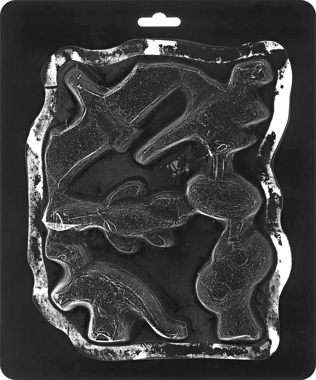 "Membrane of the new" shows a series of analog photograms in which the translucent plastic packaging of toys is used to expose the photographic paper instead of a conventional negative.